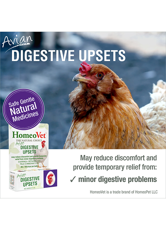 A natural liquid remedy that may help provide temporary relief from common digestive issues for chickens, other poultry and pet birds. This gentle, natural remedy may help treat symptoms like diarrhea, pale combs/wattles and retained gas.