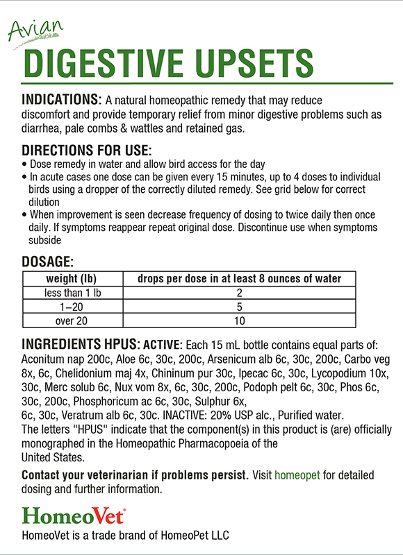 Veterinary-formulated with high-quality homeopathic ingredients, Avian DIGESTIVE UPSETS is available without a prescription and is great value for money, making it your natural choice to support your birds’ digestive health. Its liquid format makes dosing simple and easy and it is safe for birds of all types and ages, including chicks, pullets and layers.Â