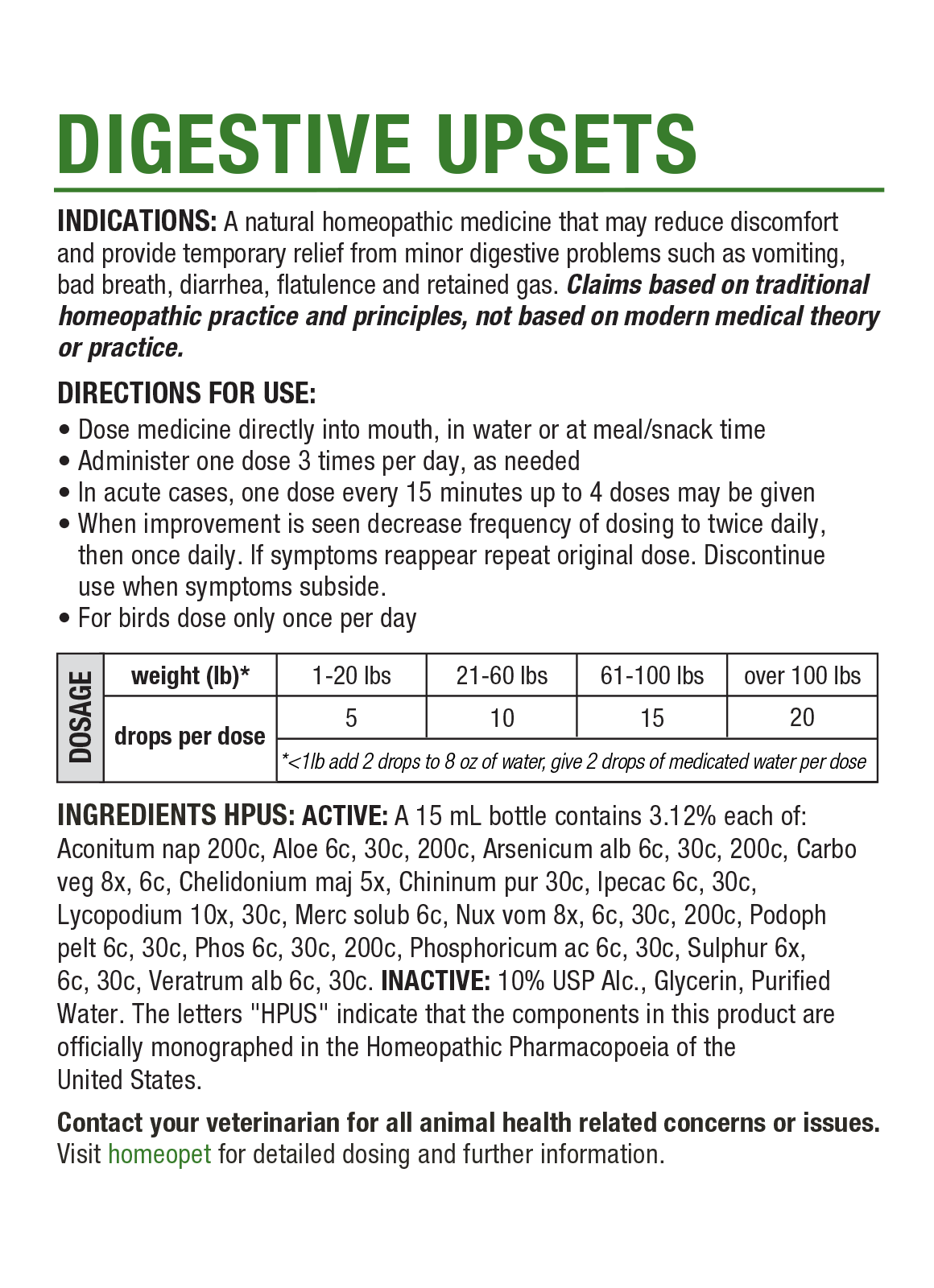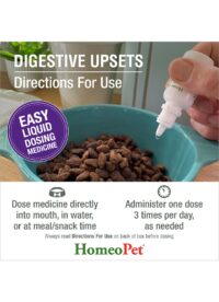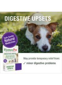 A natural remedy that may help provide gentle, natural relief for common digestive issues in pets, including dogs, cats, and other small animals. DIGESTIVE UPSETS may help provide temporary relief from minor digestive problems such as vomiting, diarrhea, flatulence, bad breath, and retained gas. This easy-to-administer liquid remedy is veterinarian-formulated and may help reduce discomfort caused by minor intestinal issues.