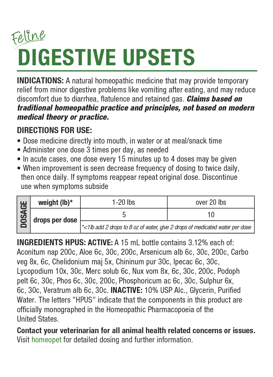 Homeopet Digestive medicine has worked really well for my cats. I had one a few weeks ago that stopped eating, luckily I already had this product. It took about 3 days for his appetite to come back, I was giving him fluids and liquid food also. I was afraid that I was going to lose him. Then, on the 4th day he started eating again, without vomiting. It was amazing! That was about a month ago, now he’s a big eater again. Thanks