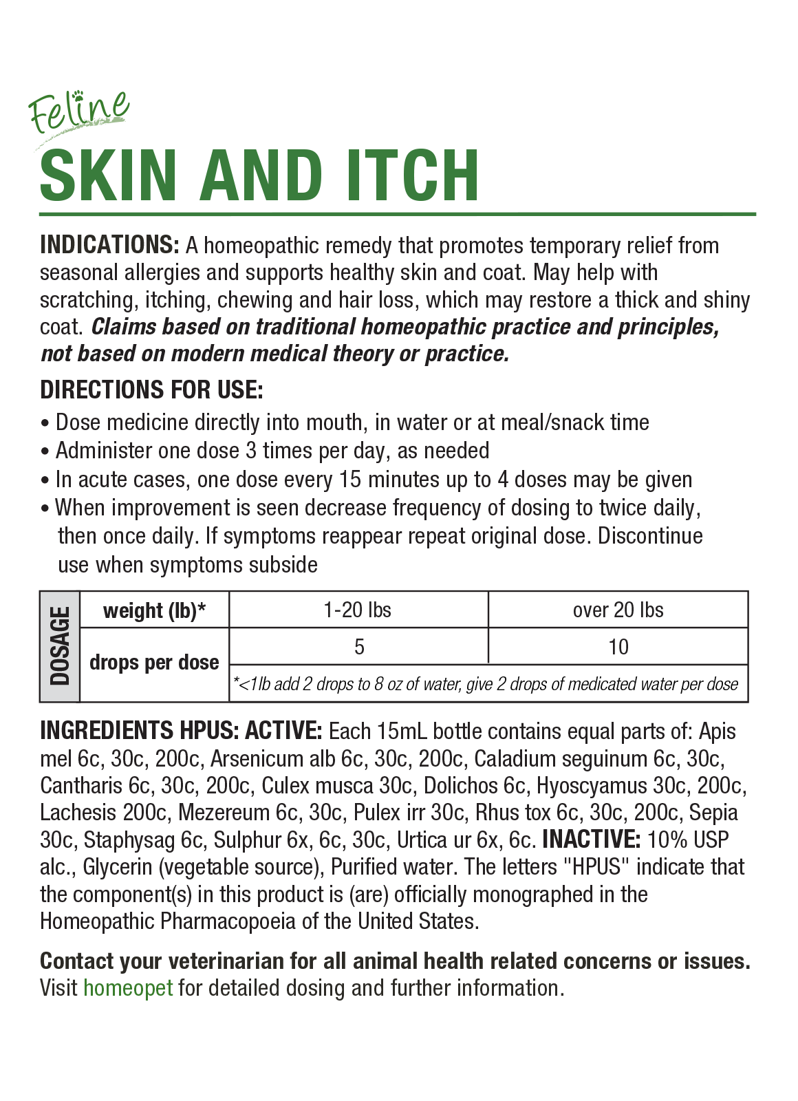 A veterinary-formulated natural remedy that may help promote temporary relief from seasonal allergies in cats. Safe, gentle and made with high-quality homeopathic ingredients, Feline SKIN AND ITCH may help to relieve scratching, itching, chewing, and hair loss which may help to restore a thick and shiny coat. If there is an element of anxiety it can be combined or alternated with HomeoPet FELINE ANXIETY.
