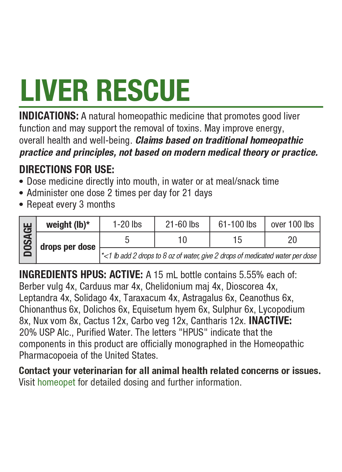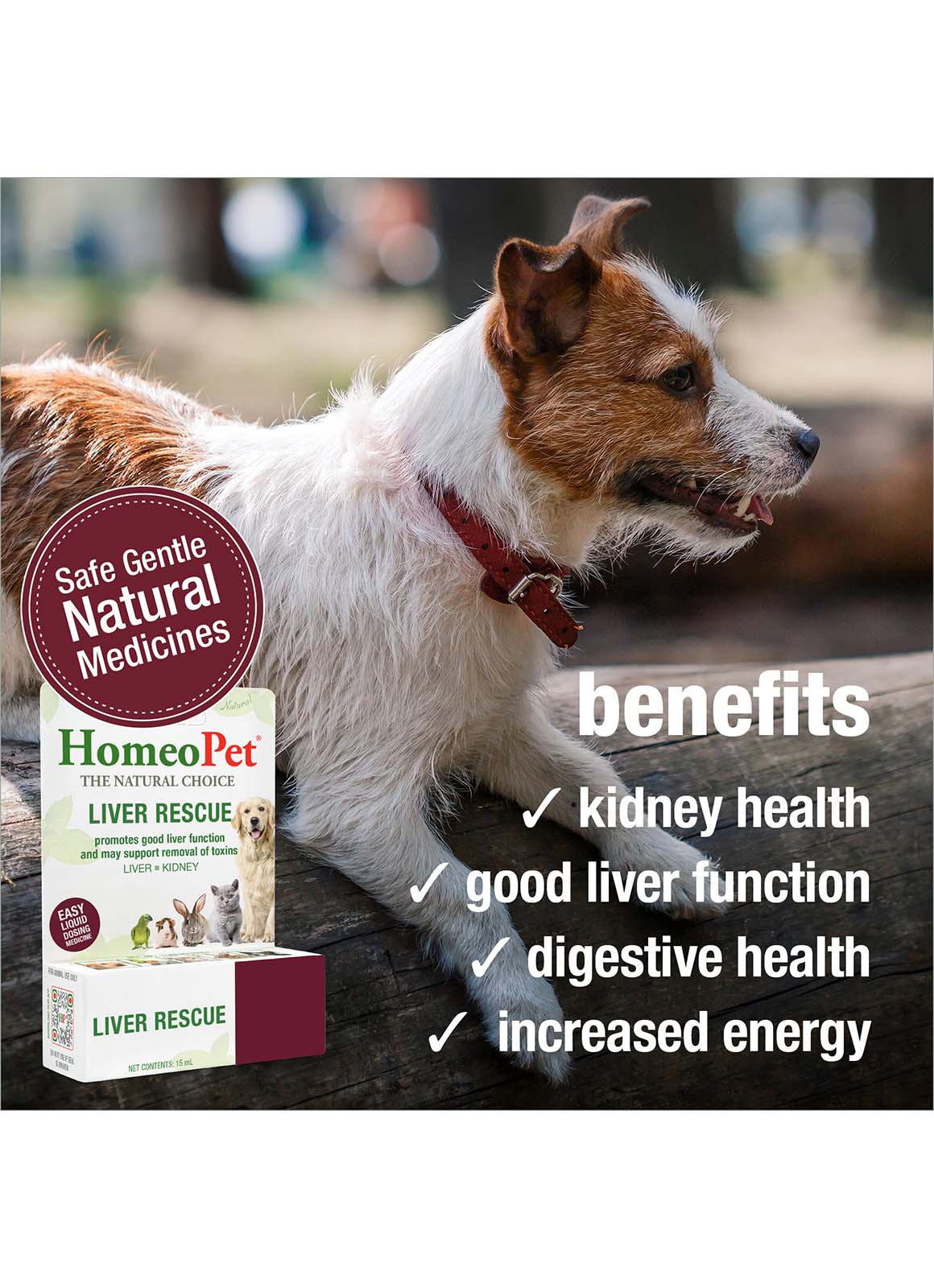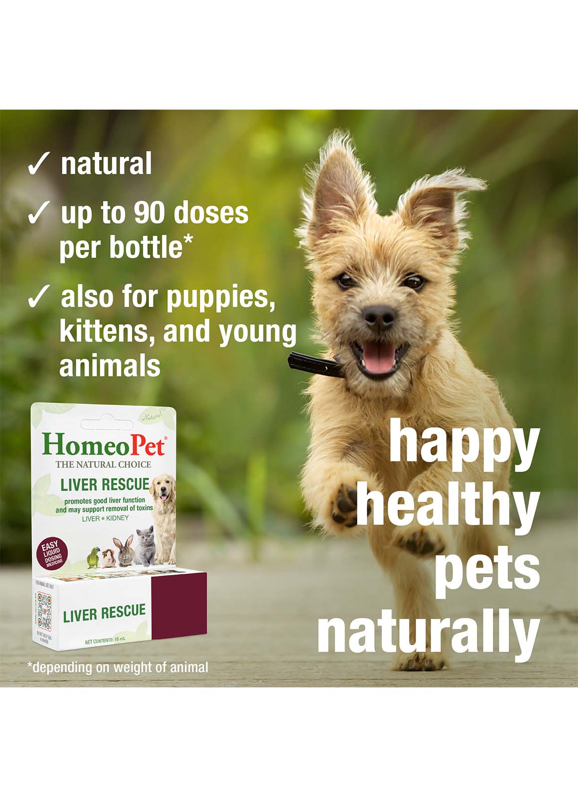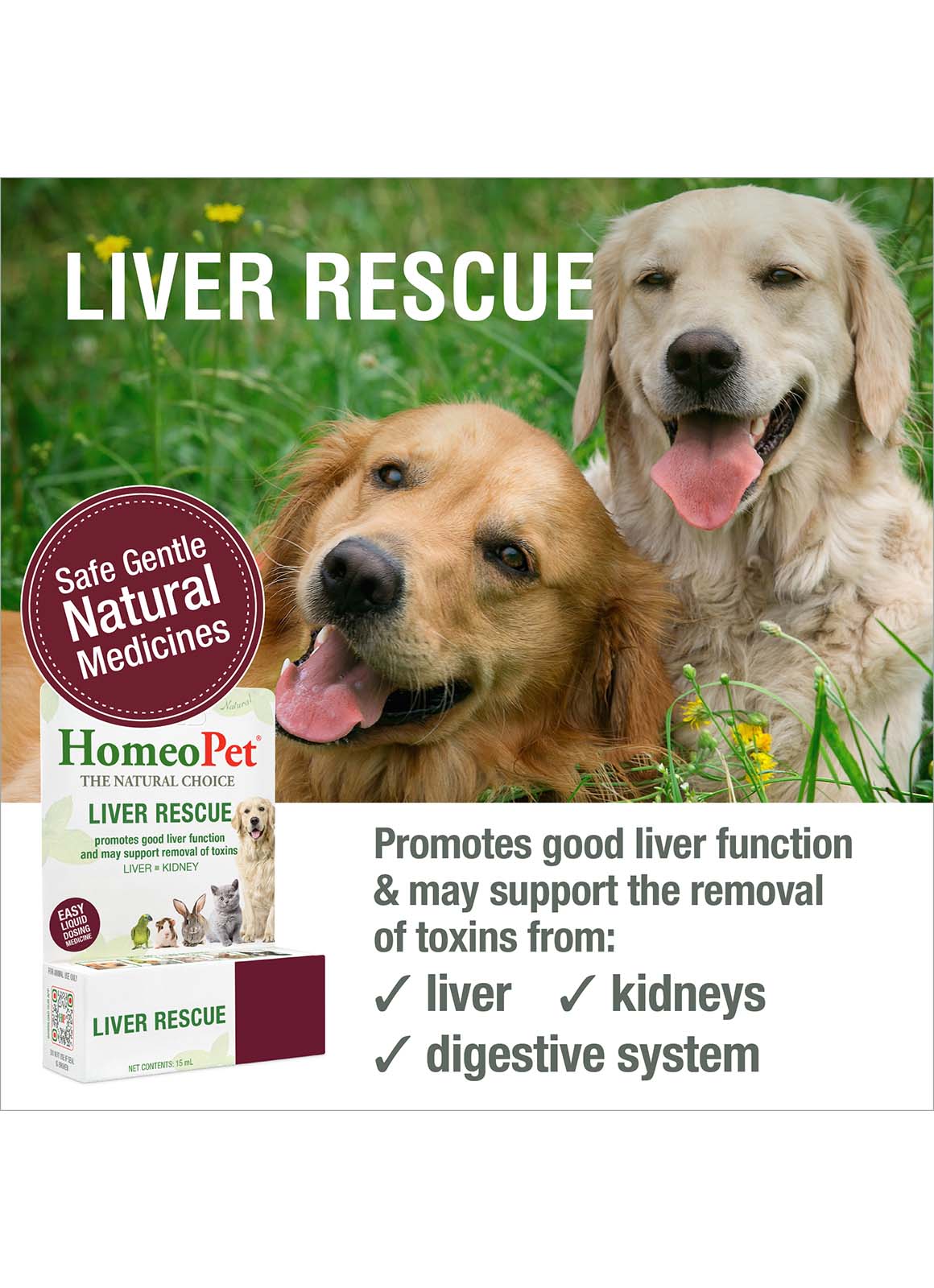 HomeoPet LIVER RESCUE offers natural liver support for animals of all shapes and sizes, and may help promote good liver function for overall health and vitality. Formulated by veterinarians, LIVER RESCUE is a safe and gentle liquid remedy that may help in the removal of toxins from the liver, helping to support your pet’s natural detoxification processes. Some ingredients may also provide kidney support, helping to promote overall organ health and keep your pet feeling their best.Â