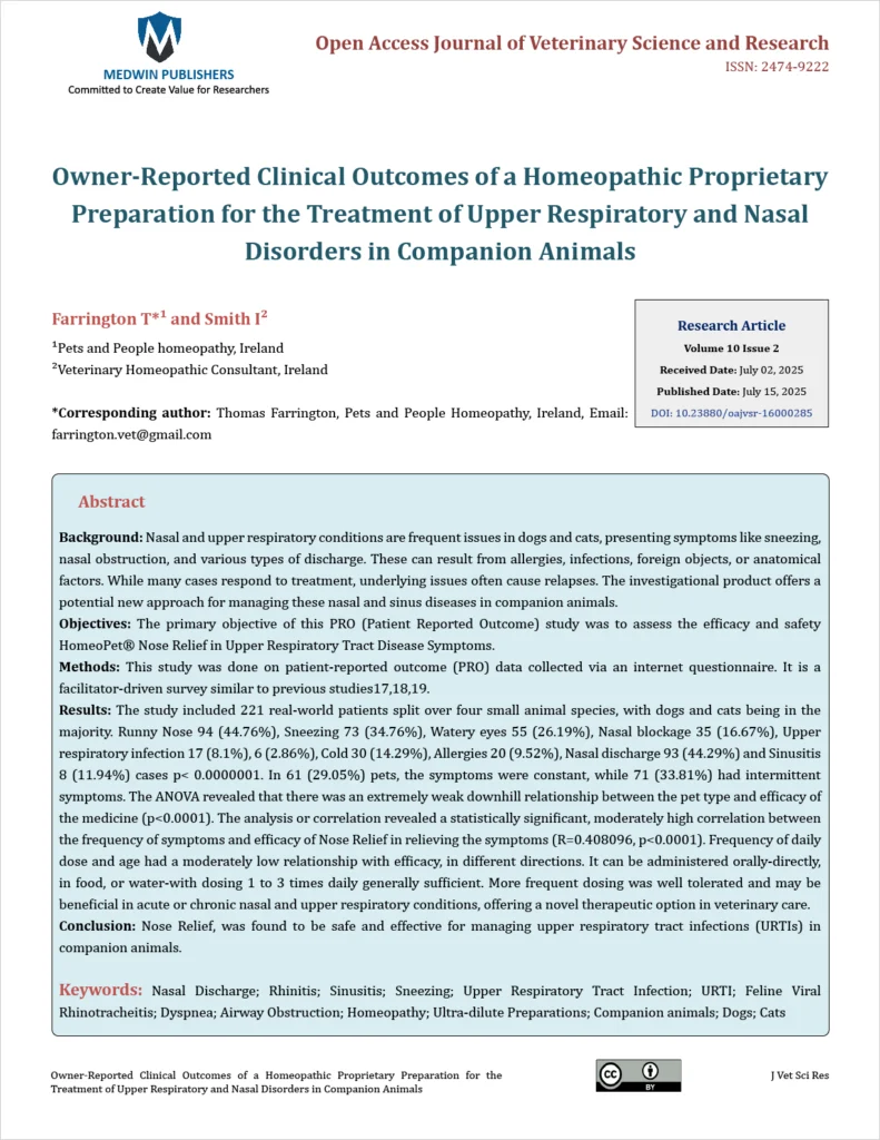 HomeoPet NOSE RELIEF remedy may naturally and safely help support certain nasal and sinus tract issues in pets, including dogs, cats, puppies, kittens, and other small animals. This easy-to-administer natural remedy may help alleviate symptoms such as runny nose, watery eyes, sneezing, and congestion.