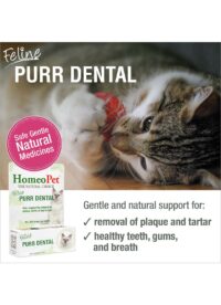 Made with quality, homeopathic ingredients, Feline PURR DENTAL’s natural formula may also help combat bad breath, making it an essential addition to your cat’s dental care routine.Â